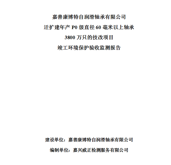 ?嘉善康博特自潤滑軸承有限公司遷擴建年產P0級直徑60毫米以上軸承3800萬只的技改項目竣工環境保護驗收監測報告????????建設單位:嘉善康博特自潤滑軸承有限公司編制單位:嘉興威正檢測服務有限公司?